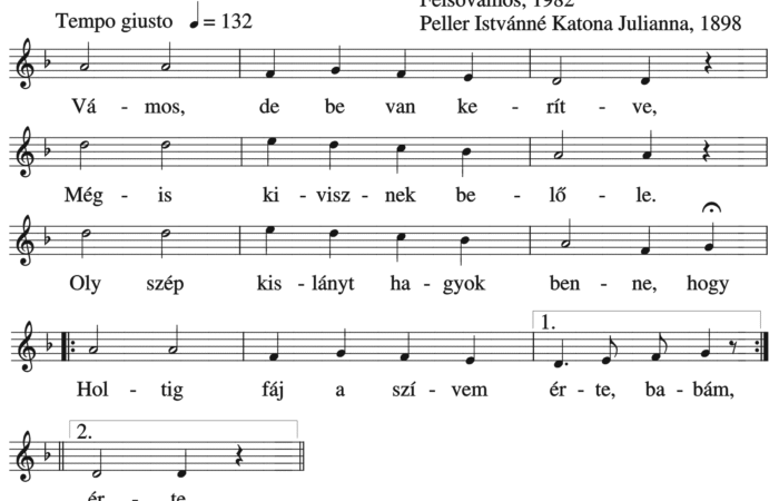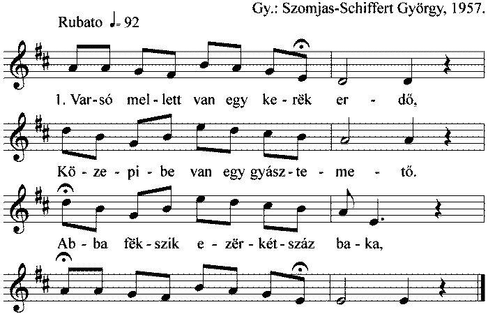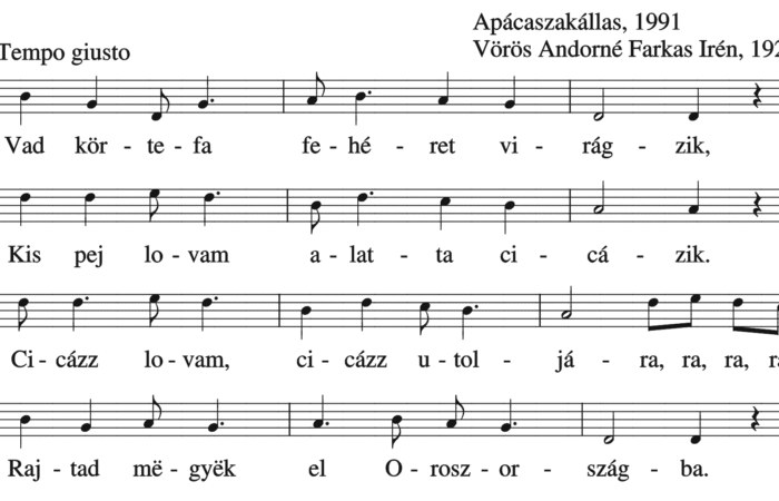 Vadkörtefa fehéret virágzik, Kis pej lovam alatta cicázik. Cicázz lovam, cicázz utoljára, ra, ra, ra, Rajtad mëgyëk el Oroszországba. (a...