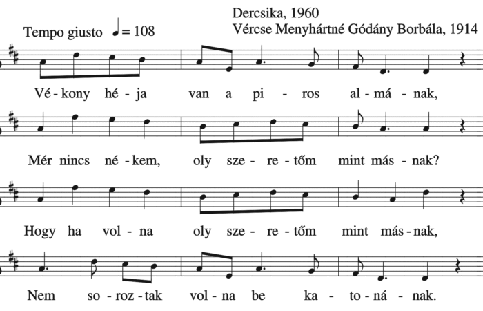Vékony héja van a piros almának, Mér nincs nékem oly szeretőm, mint másnak? Hogy ha volna oly szeretőm, mint másnak,...