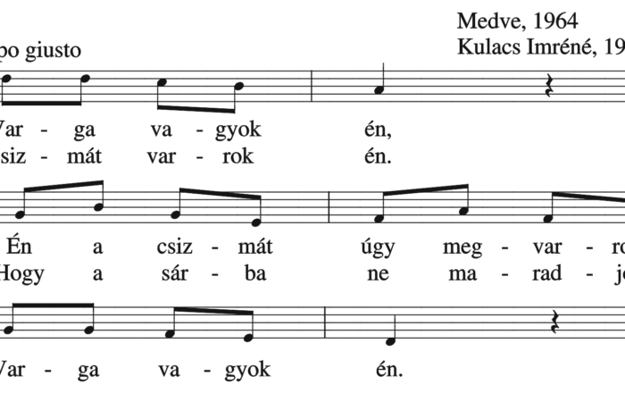Varga vagyok én, Csizmát varrok én. Én a csizmát úgy megvarrom, Hogy a sárba nem maradjon. Varga vagyok én.