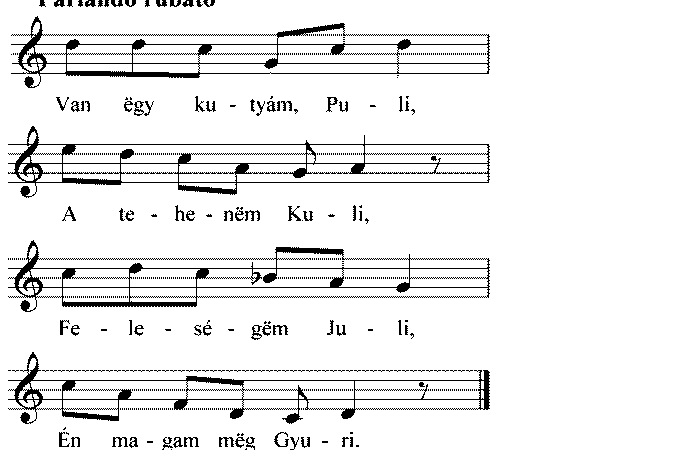 1. Van ëgy kutyám, Puli, A tehenëm Kuli, Feleségëm Juli, Én magam mëg Gyuri. 2. Fiadzik a Puli, Ellik már...