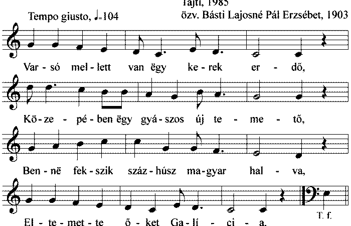 Varsó mellett van ëgy kerek erdő, Közepében ëgy gyászos új temető, Bennë fekszik százhúsz magyar halva, Eltemette őket Galícia.