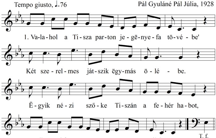 1. Valahol a Tisza parton jegënyefa tövébe’, Két szerelmes játszik ëgymás ölébe, Ëgyik nézi szőke Tiszán a fehér habot, Másik...