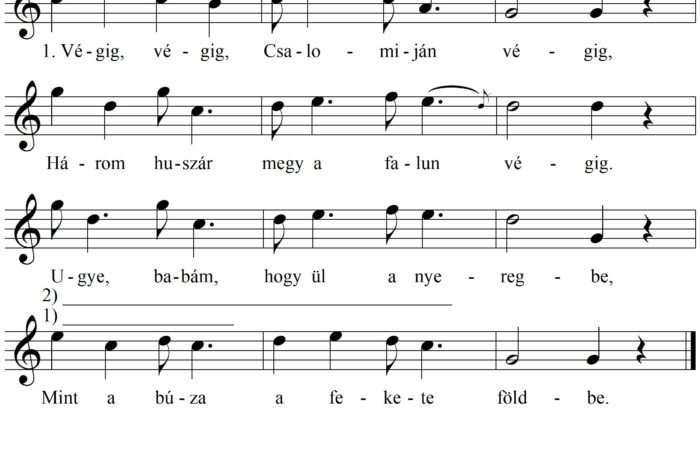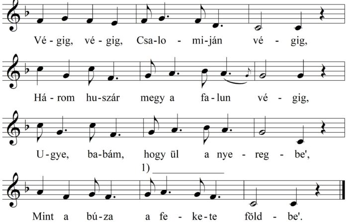 1. Végig, végig, Csalmiján végig. Három huszár megy a falun végig, Ugye, babám, hogy ül a nyeregbe’, Mint a búza...