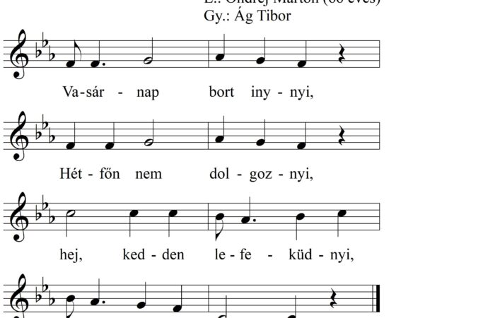 1. Vasárnap bort innyi, Hétfőn nem dolgoznyi, Hej, kedden lefeküdnyi, Szeredán felkelnyi. 2. Csütörtökön írnyi, Pénteken számolnyi, Szombaton megkérdeznyi, Hogy...