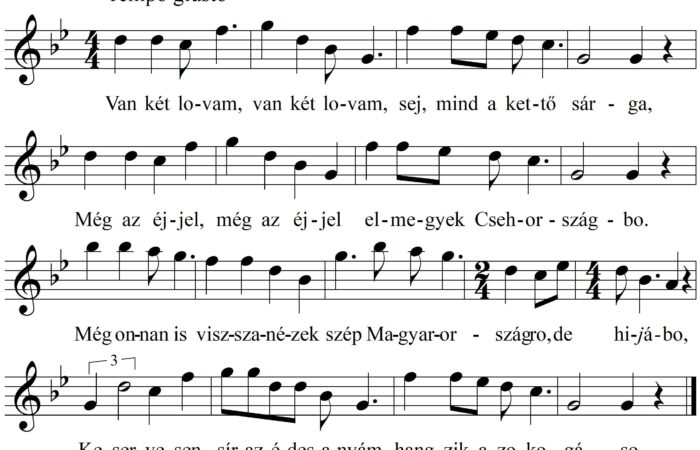 1. Van két lovam, van két lovam, sej, mind a kettő sárga, Még az éjjel, még az éjjel, elmegyek Csehországbo....