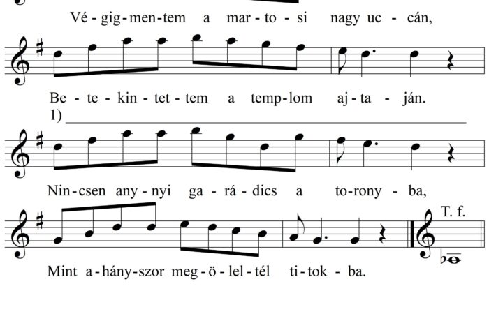 1.Végigmentem a martosi nagy uccán, Betekintettem a templom ajtaján. Nincsen annyi garádics a toronyba, Mint ahányszor megölelnél titokba. 2. Végigmentem...
