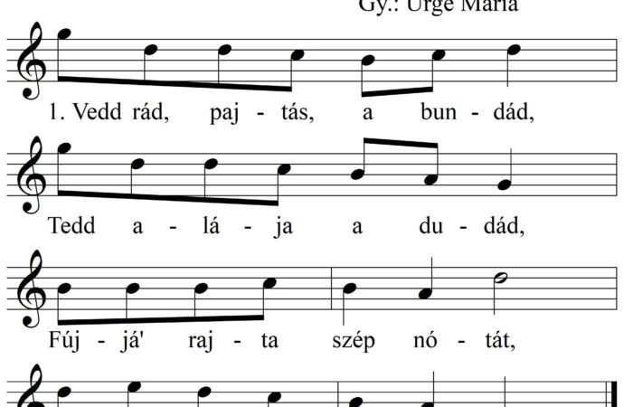 1. Vedd rád, pajtás, a bundád, Tedd alája a dudád, Fújjá‘ rajta szép nótát, Vígasztaljuk Jézuskát. 2. Gyere, pajtás, siessünk,...