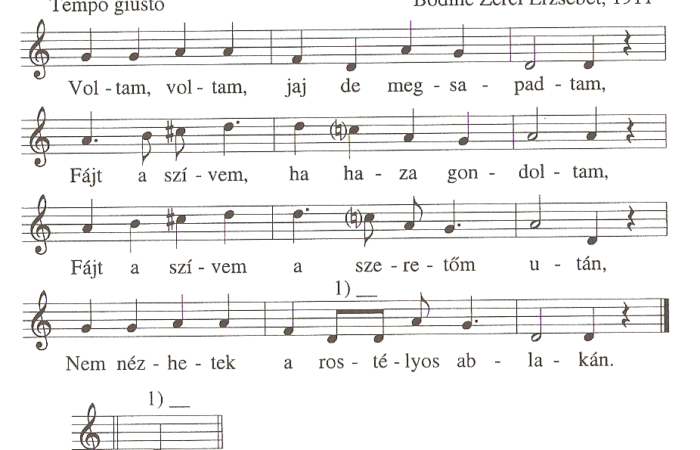 Vérrël virít a csucsomi erdő, Mer’ mëglőttë magát a kerülő. András bácsi mér’ lőttë mëg magát? Kirë hagyja a három...