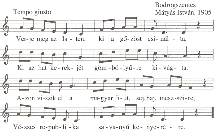 1. Verje meg az Isten, ki a gőzöst csinálta,Ki az hat kerekjét gömbölyűre kivágta,Azon viszik a magyar fiút, sej, haj,...