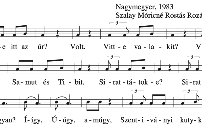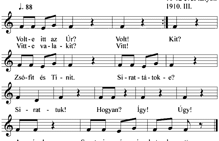Volt-e itt az Úr? Volt! Vitt-e valakit? Vitt! Kit? Zsófit is Tinit. Sirattátok-e? Sirattuk! Hogyan? Így! Úgy! Amúgy! Szentiványi kutykurutty.