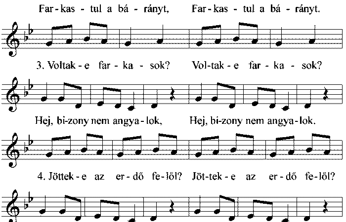 1. Volt-e olyan juhász, volt-e olyan juhász, Hej, huj, tirajlárom, hej, huj, tirajlárom. 2. Ki megtudná őrizni, ki megtudná őrizni, Farkastul...