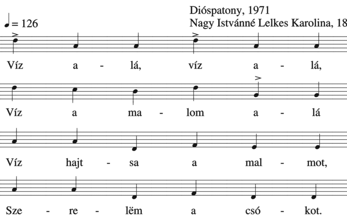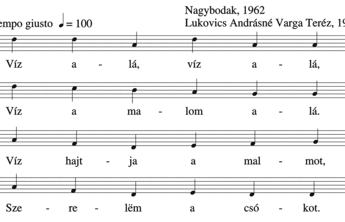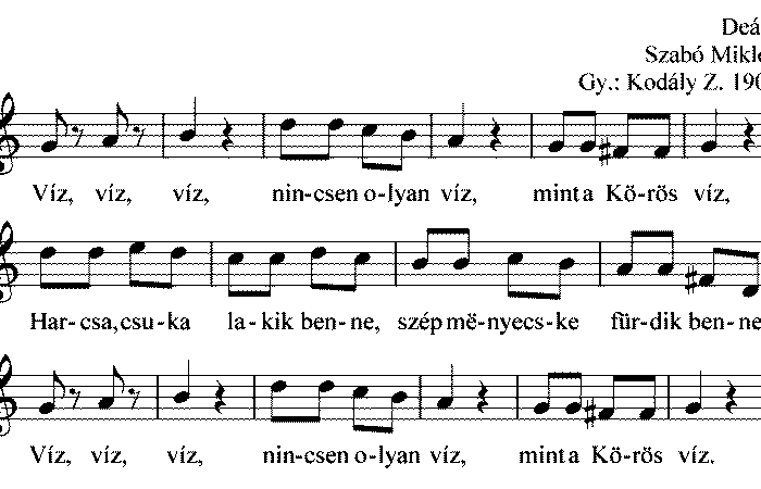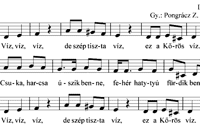 Víz, víz, víz, De szép tiszta víz, Ez a Körös víz, Csuka, harcsa lakik benne, Fehér hattyú fürdik benne. Víz,...