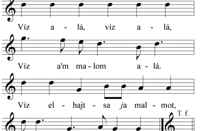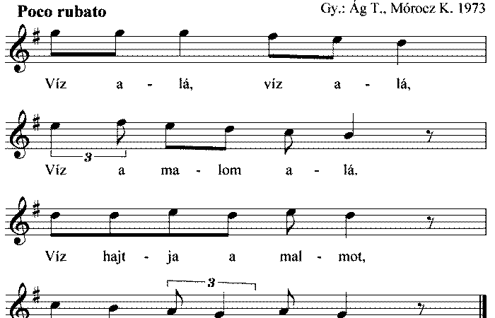 Víz alá, víz alá, Víz a malom alá. Víz hajtsa a malmot, Szerelëm a csókot. Nincsen széna, szalma, A széna...