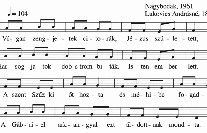 Vígan zengjetek citorák, Jézus született, Harsogjatok dob s trombiták, Isten ember lett. A szent Szűz, ki őt hozta és méhibe...