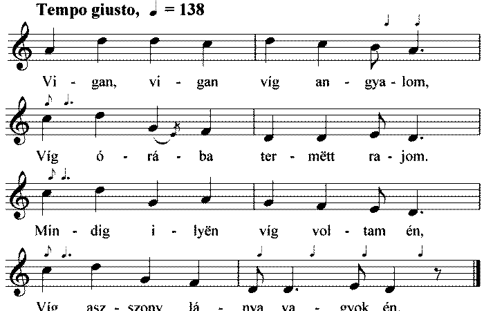 1. Vígan, vígan víg angyalom, Víg órámban termëtt rajom. Mindig ilyën víg voltam én, Víg asszony lánya vagyok én. 2....