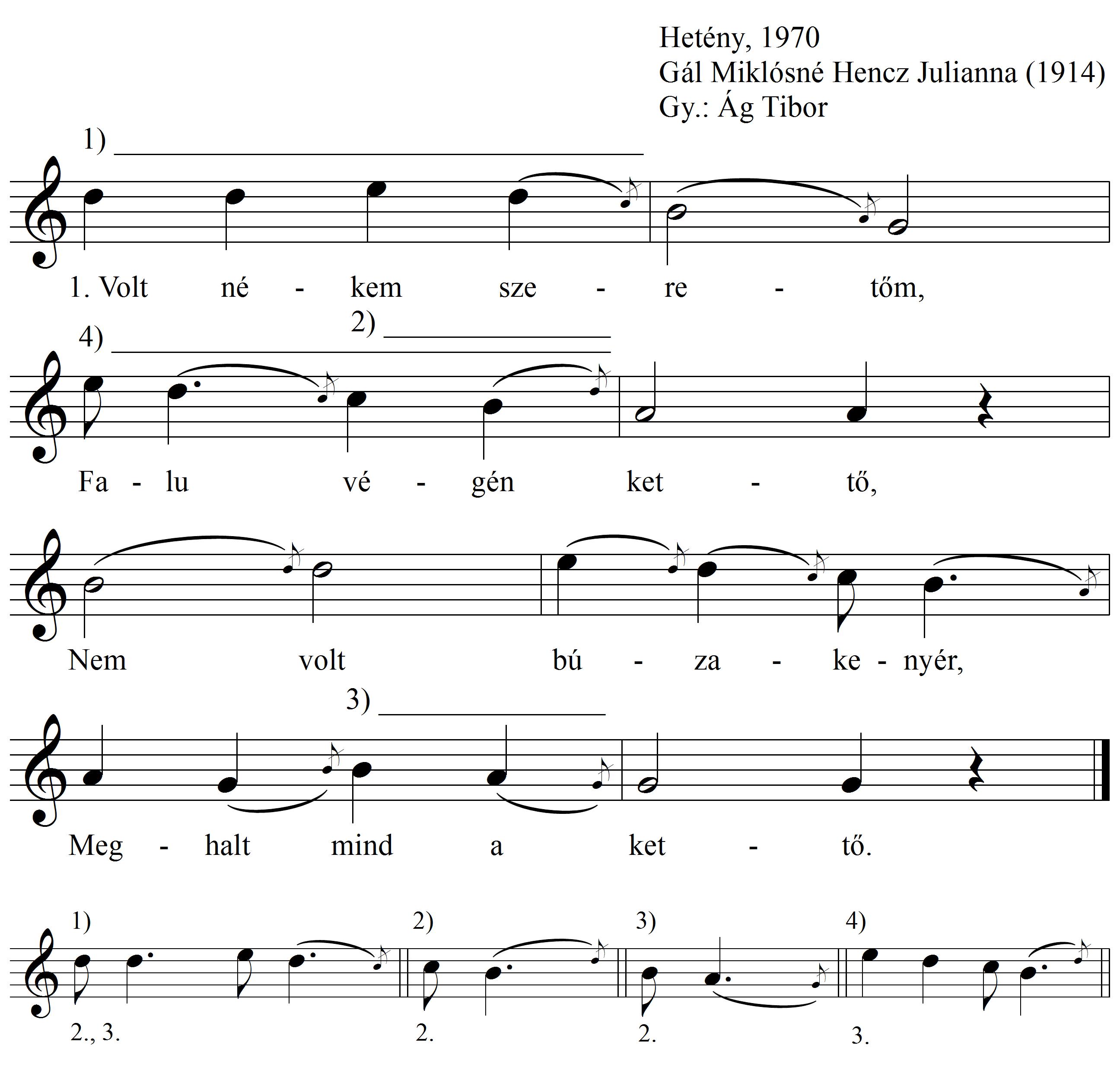 1. Volt nékem szeretőm, Falu végén kettő, Nem volt búzakenyér, Meghalt mind a kettő. 2. Egyiket temettem Virágos kis kertbe. Másikat...