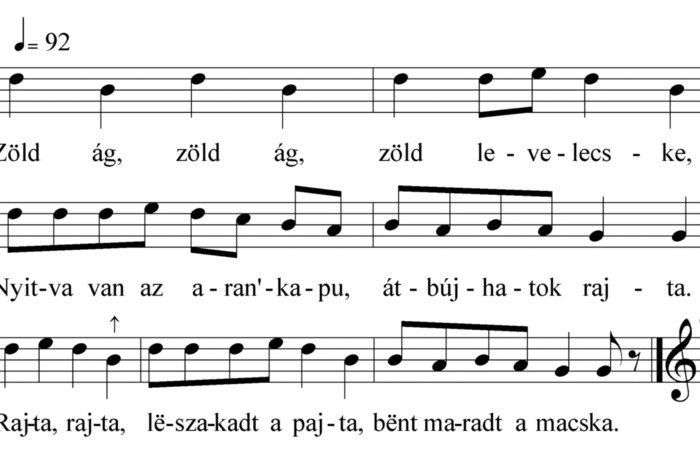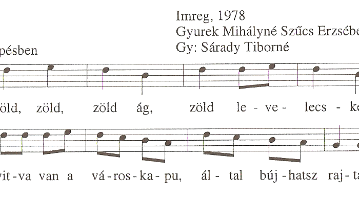 Zöld, zöld, zöld ág, zöld levelecske,Nyitva van a városkapu, által bújhatsz rajta.