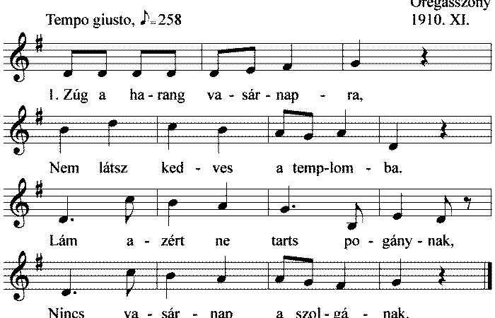 1. Zúg a harang vasárnapra, Nem látsz kedves a templomba. Lám azért ne tarts pogánynak, Nincs vasárnap a szolgának. 2....
