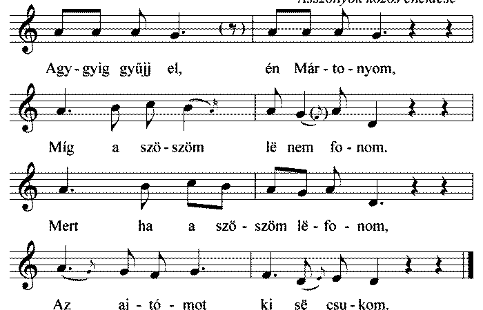 Aggyig gyűjj el én Mártonyom, Míg a szöszöm lë nem fonom. Mert ha a szöszöm lëfonom, Az ajtómot ki së...