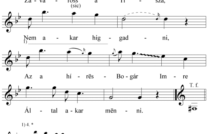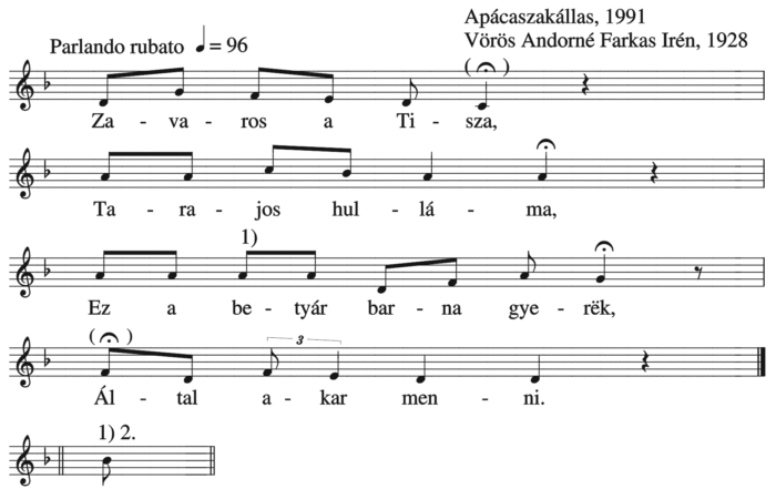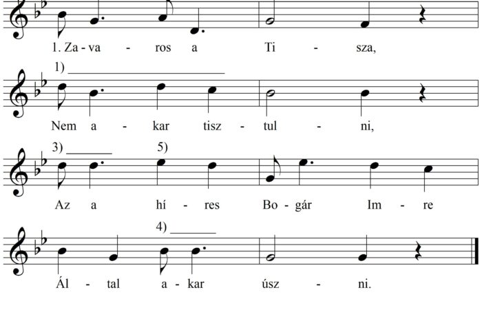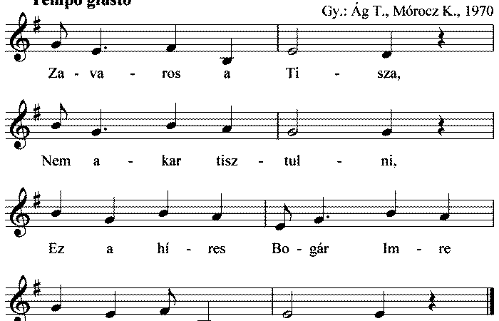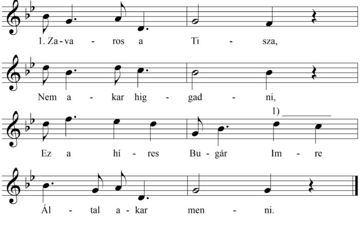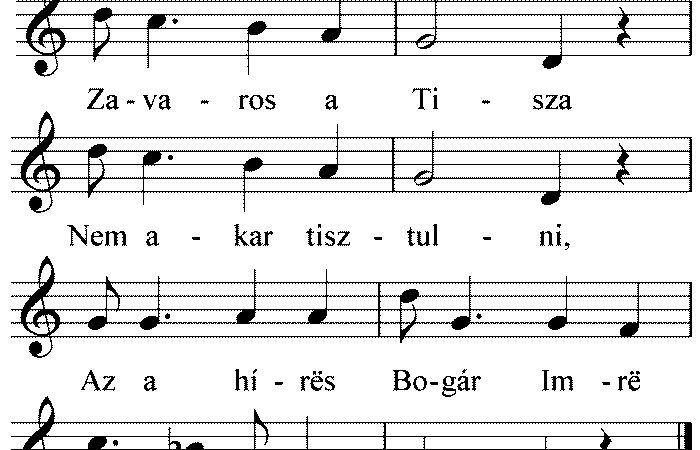 1. Zavaross (sic) a Tisza, Nem akar higgadni, Az a hírës Bogár Imre Által akar mënni. 2. Által akar mënni, Lovat akar...