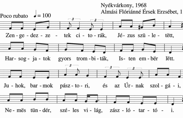 Zengedezzetek citorák, Jézus születëtt, Harsogjatok gyors trombiták, Isten embër lëtt. Juhok, barmok pásztori és Úrnak szolgái, Nemës tündér, széles világ...