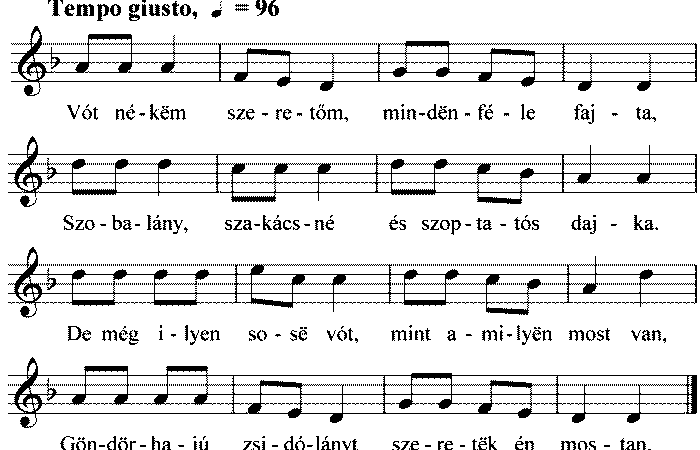 Vót nékëm szeretőm, mindënféle fajta, Szobalány, szakácsné és szoptatós dajka. De még ilyen sosë vót, mint amilyën most van, Göndörhajú...