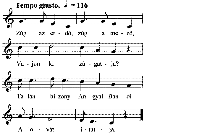 1. Zúg az erdő, zúg a mező, Vajon ki zúgatja? Talán bizony Angyal Bandi A lovát itatja. 2. Víg ő...