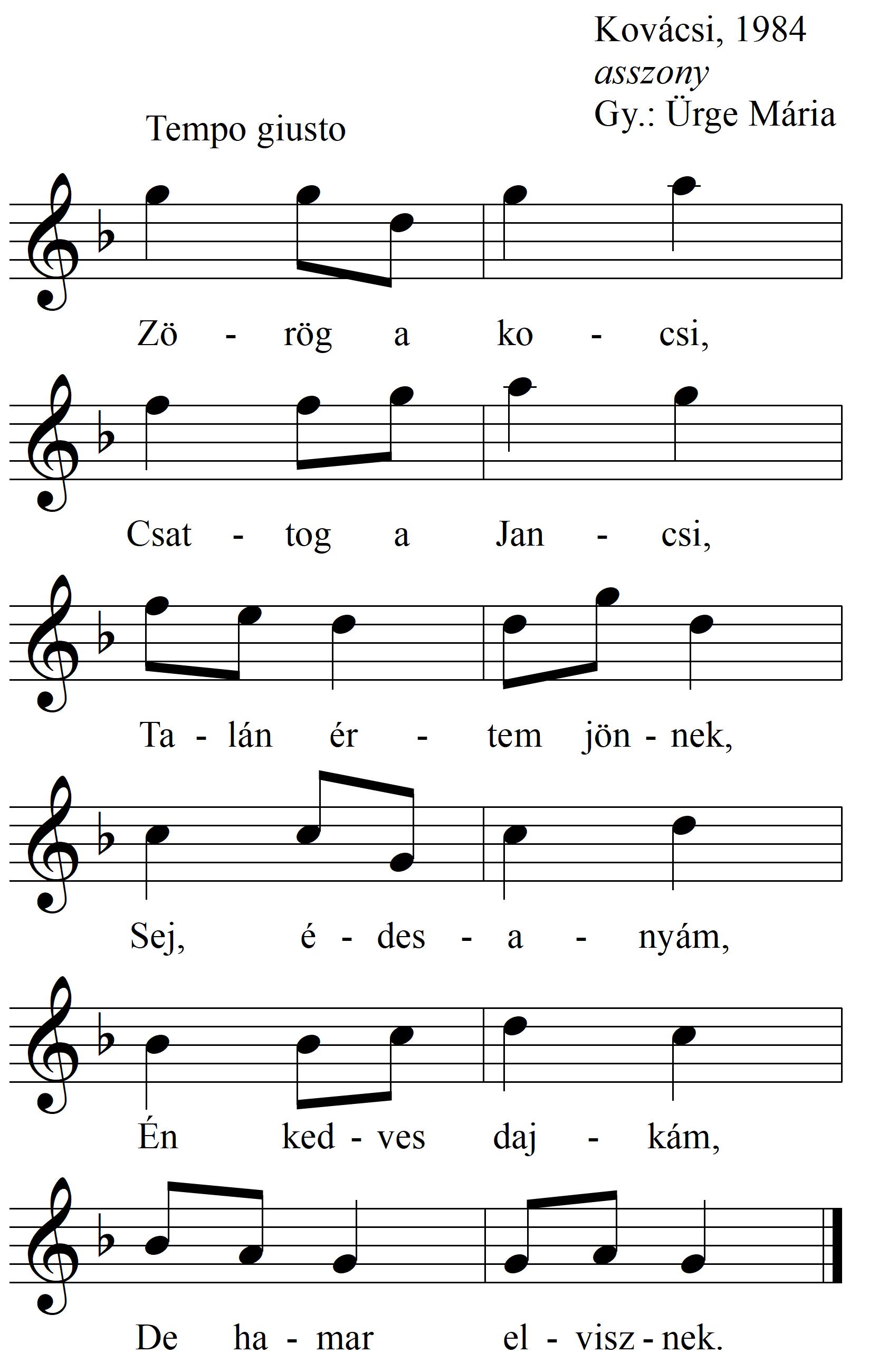 1. Zúg az erdő, zúg az erdő, Vajon ki zúgatja? Talán bizony ez a Vince A lovát itatja. 2. Virág...