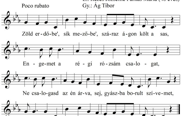 1. Zöld erdőbe’, sík mezőbe’ száraz ágon költ a sas, Engemet a régi rózsám csalogat, Ne csalogasd az én árva,...