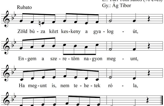 1. Zöld búza közt keskeny a gyalogút, Engem a szeretőm nagyon megunt, Ha megunt is, nem tehetek róla, Leány vagyok,...