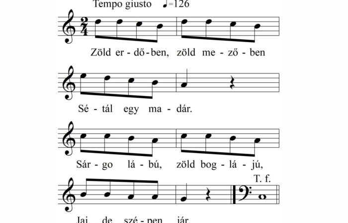 1. Zöld erdőben, zöld mezőben Sétál egy madár. Sárgo lábú, zöd boglájú, Jaj, de szépen jár. 2. Egyik ágán Pethő...