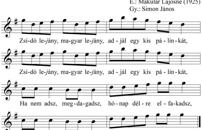 Zsidó lejány, magyar lejány, adjál egy kis pálinkát, Zsidó lejány, magyar lejány, adjál egy kis pálinkát, Ha nem adsz, megdagadsz,...