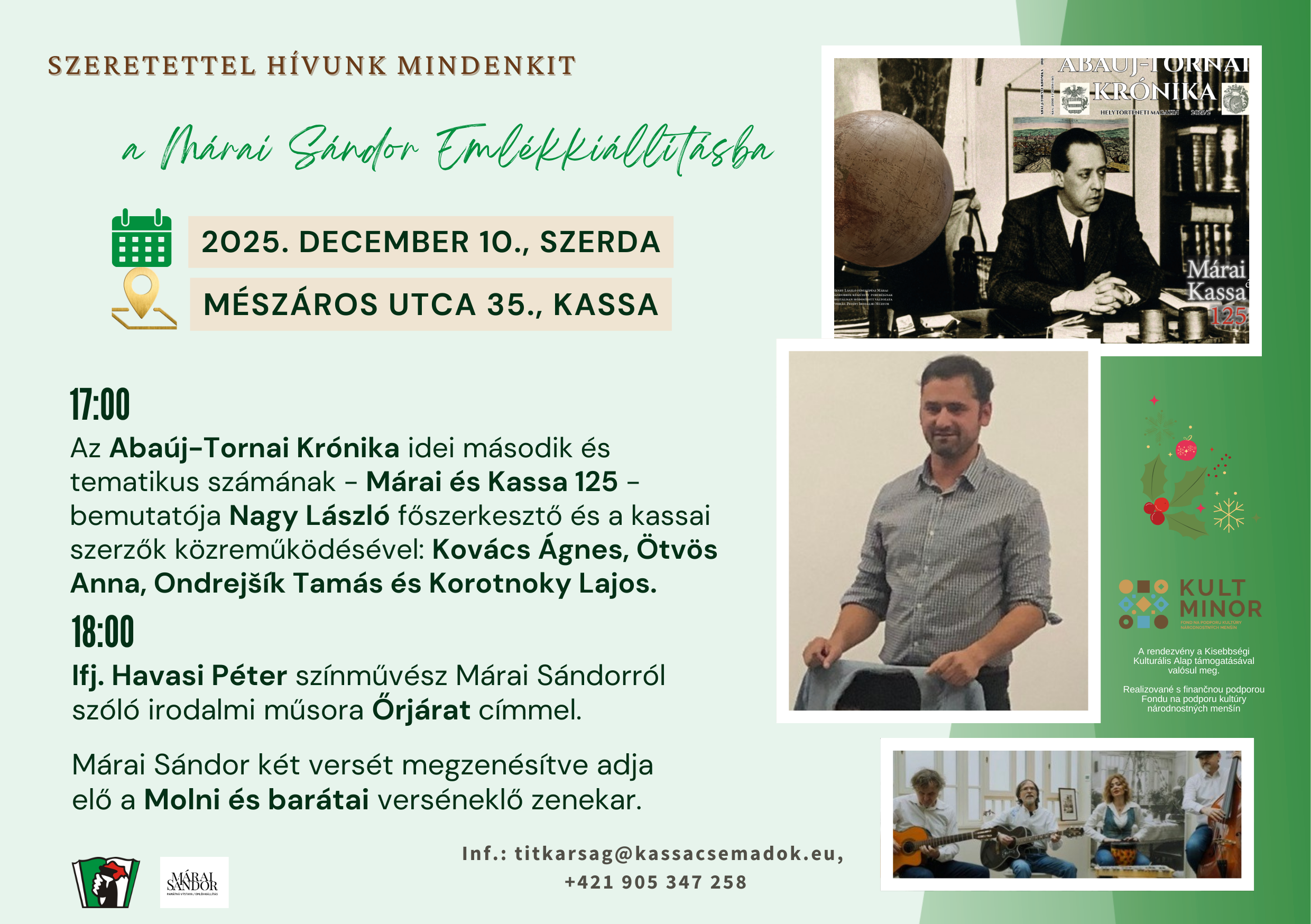Szeretettel hívunk minden kedves érdeklődőt 2025. december 10-én, szerdán, a kassai Márai Sándor Emlékkiállításba, a Mészáros utca (Mäsiarska) 35. szám alá. Az est programja: 17:00 Az Abaúj-Tornai Krónika idei második és tematikus számának - Márai és […] |