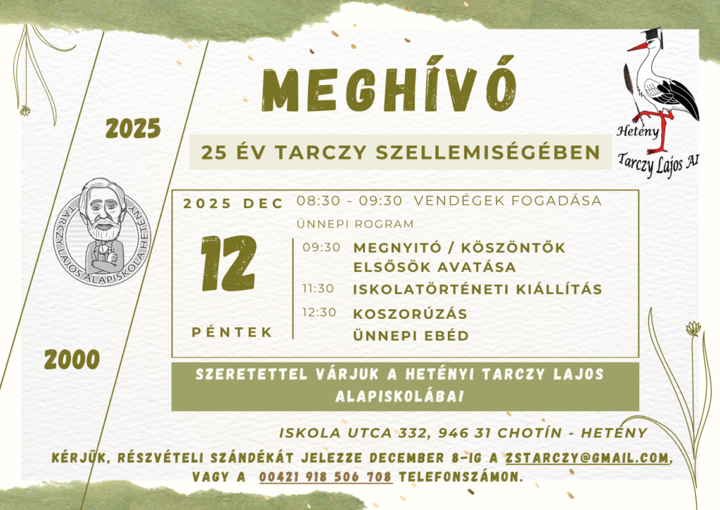 Szeretettel és tisztelettel hívjuk Önöket a Tarczy Lajos Alapiskola ünnepségére, amelyet a magyar oktatás újjáalakulásának 75. évfordulója és iskolánk névadásának 25. évfordulója alkalmából rendezünk.