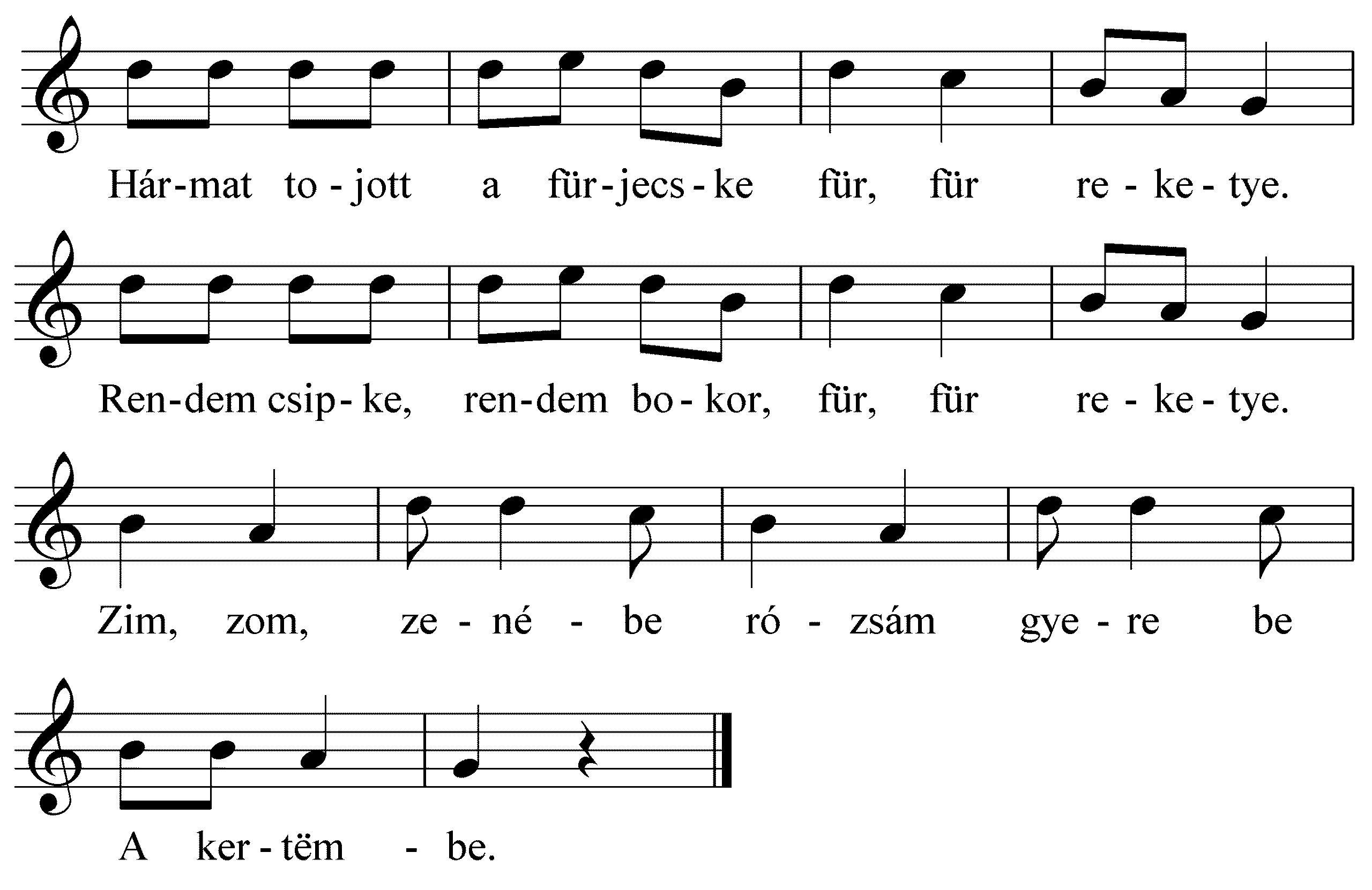 Hármat tojott a fürjecske, Für, für, reketye. Rendem csipke, rendem...