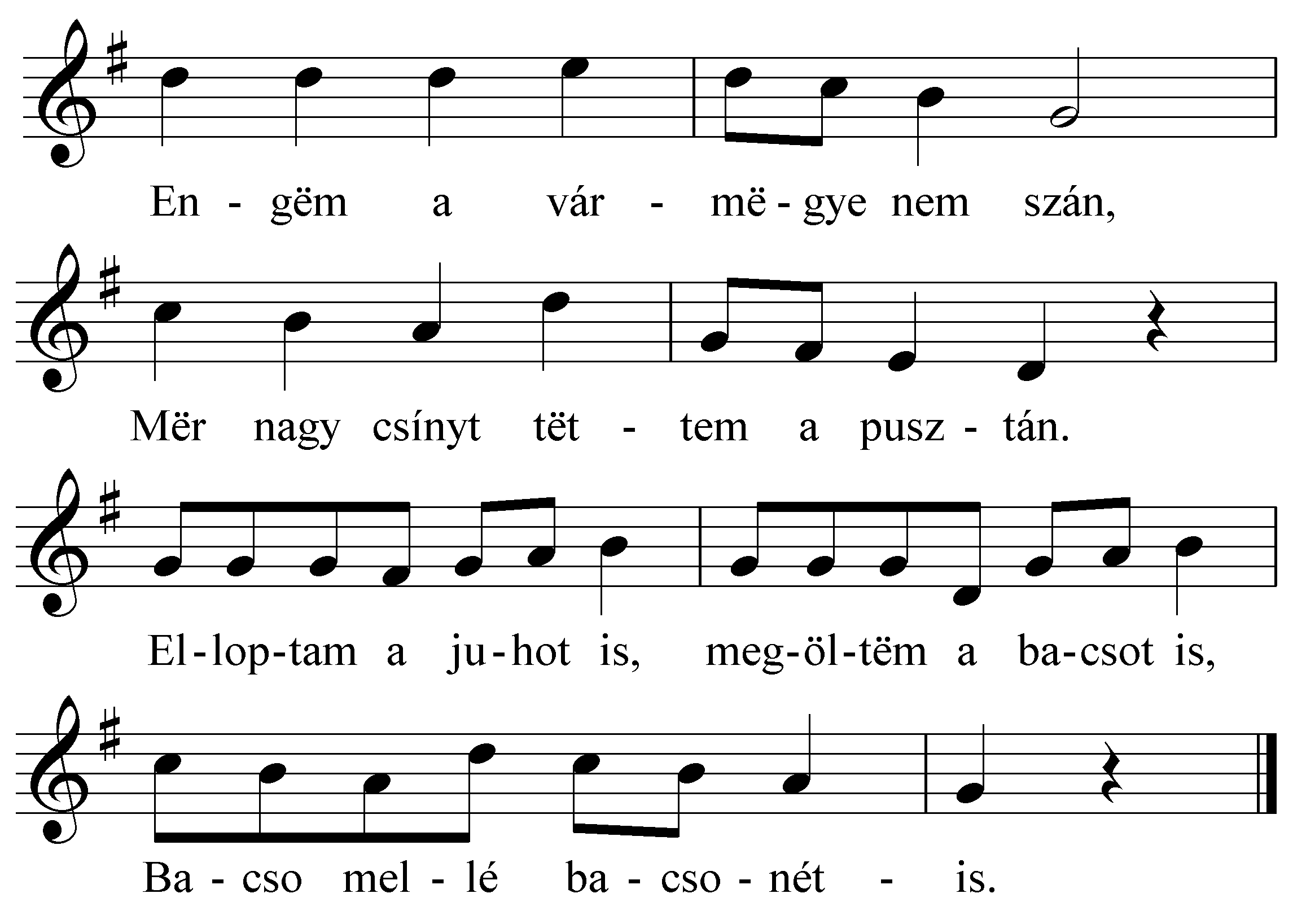 1. Engëm a vármëgye nem szán, Mër nagy csínyt tëttem...